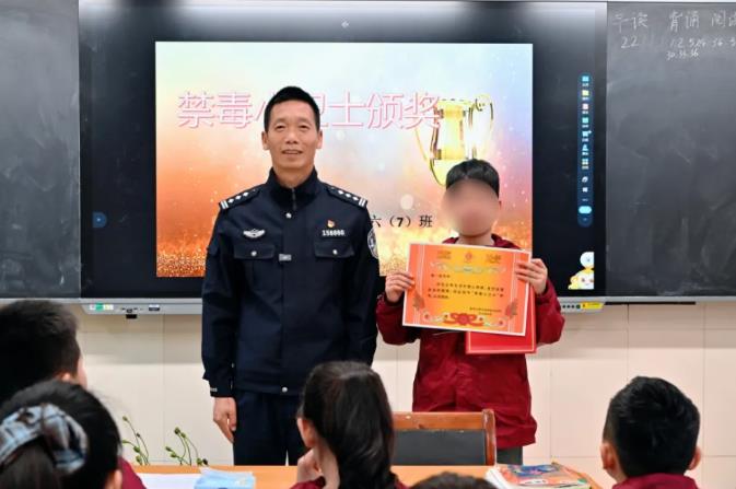 “小朋友学的知识很全面,感谢你为社会作出了贡献”民警连连称赞小宋的警惕性和责任感。为表扬小宋同学,4月10日上午,赤松派出所所长严科来到学校,将“禁毒小卫士”的奖状颁发给他。