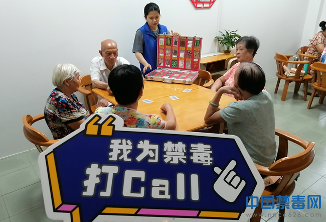 图为社工向老年人展示毒品仿真模型。中国禁毒网发