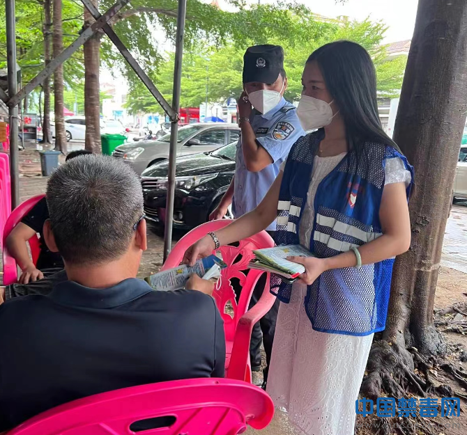 图为禁毒志愿者向群众发放禁毒宣传手册。中国禁毒网发