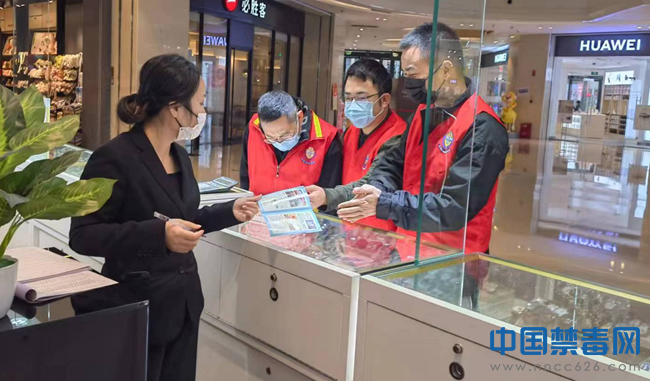 图为禁毒志愿者向商场职工发放禁毒宣传手册。中国禁毒网发
