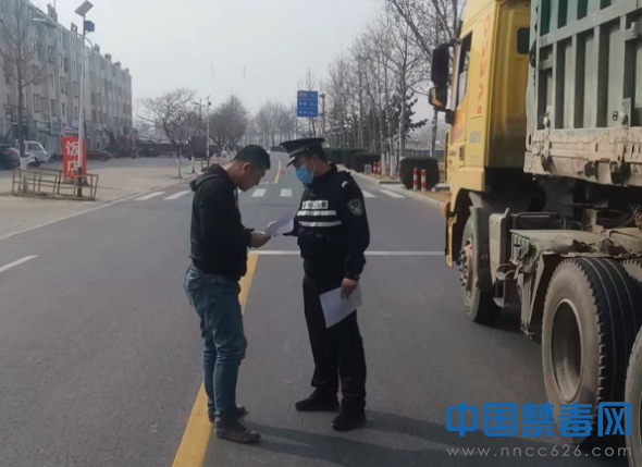 图为民警向车辆驾驶员发放《货运司机运输易制毒物品相关规定告知书》。中国禁毒网发