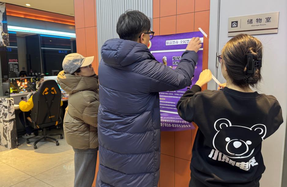 活动期间,禁毒社工们深入辖区内的中影星美国际影城与小熊电竞,通过在醒目位置张贴禁毒宣传海报、向前台工作人员发放禁毒宣传折页等方式,营造了浓厚的禁毒氛围。在电影院,禁毒社工为工作人员系统讲解了当前毒品尤其是新型毒品的种类、伪装形式及严重危害。讲解内容紧密结合影院工作实际,重点传授了日常工作中识别涉毒可疑人员、物品及异常行为的方法,例如:观察观众是否出现精神恍惚、行为怪异,是否携带可疑工具或物品出入卫生间等;发现疑似吸毒工具或包装物时的处置流程;如何在不惊扰其他观众的前提下,初步应对疑似吸毒或贩毒情况,并安全、及时地报警。影城值班工作人员表示:“这次宣传非常实用,以前总觉得毒品离我们的工作环境很远,现在清楚了该关注什么、怎么处理,心里更有底了,也多了一份守护观众安全的责任。”