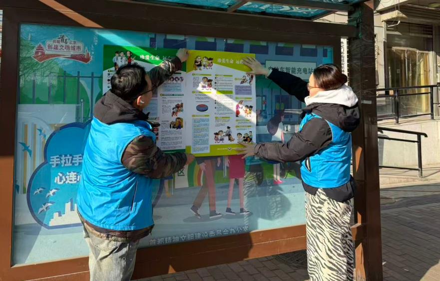 1月14日,东城区永外街道禁毒社工在安乐林社区和民主北街社区以张贴海报的形式开展禁毒宣传活动。
