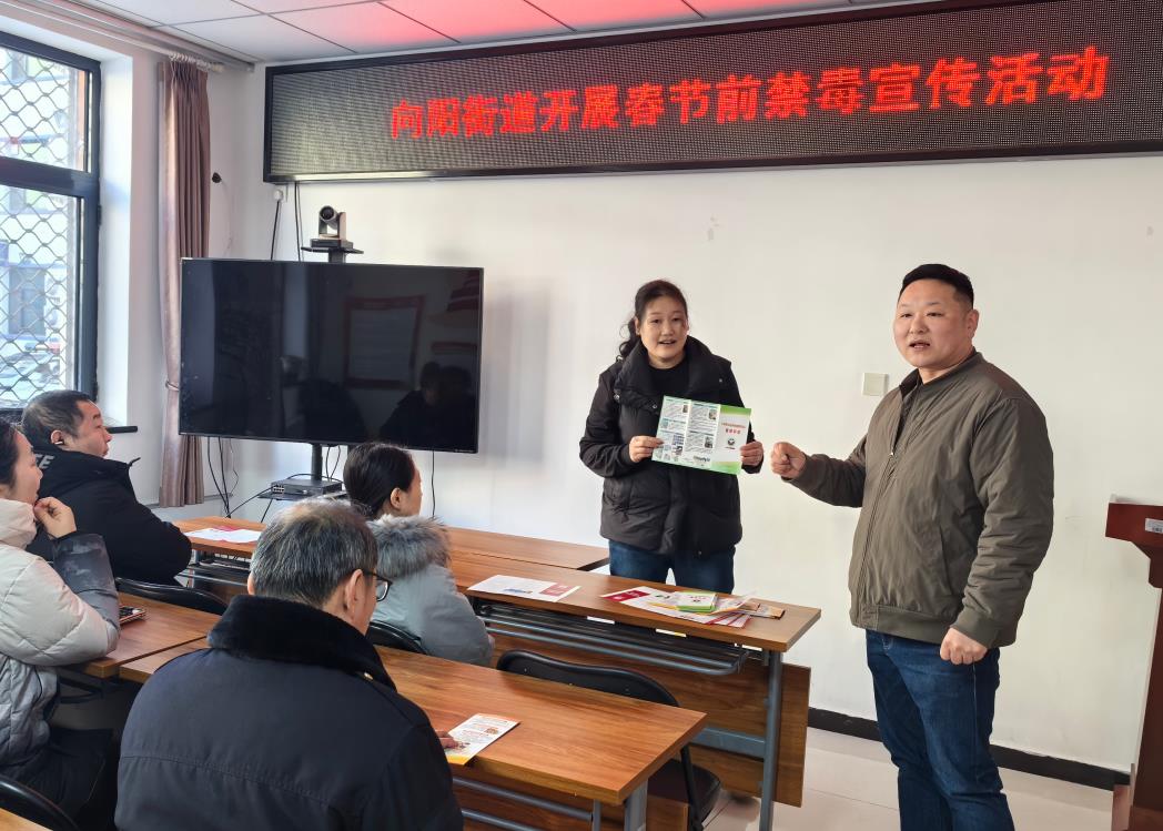活动结合春节期间人员流动频繁、亲友聚会增多的特点,在富燕二区会议室组织开展禁毒宣传专场活动,邀请居民及商铺经营者代表到场参与。现场工作人员采用“案例讲解+互动问答”的形式,以通俗易懂的语言剖析“毒奶茶”“伪装电子烟”等新型毒品的伪装特征与危害,并结合典型涉毒案例警示群众提高警惕,筑牢思想防线。同时,通过发放禁毒宣传折页与新春福袋,普及禁毒法律法规,引导群众主动举报涉毒线索。