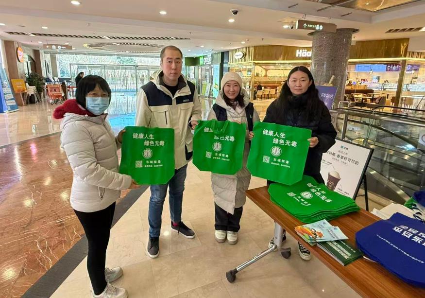 1月21日,东城区和平里街道禁毒社工在环贸大厦开展禁毒宣传活动,通过发放禁毒购物袋,向居民群众讲解如何识别毒品等方面知识,引导大家提高识毒、防毒、拒毒意识,增强抵御毒品的能力,并告诫家人和朋友对毒品要有警觉戒备认识,提高对诱惑的警惕性,采取坚决拒绝的态度。