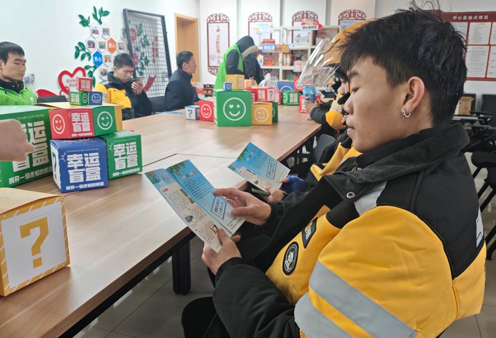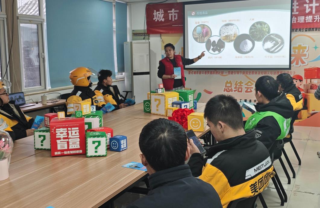 活动现场,工作人员正在大屏幕前为骑手们细致讲解传统毒品的种类和特征。骑手们围坐在一起,认真聆听学习。活动还通过摆放宣传展板、展示仿真毒品、发放宣传资料等方式,帮助骑手们快速识别毒品陷阱。现场还准备了“幸运盲盒”等互动礼品,让学习氛围更加轻松活跃。