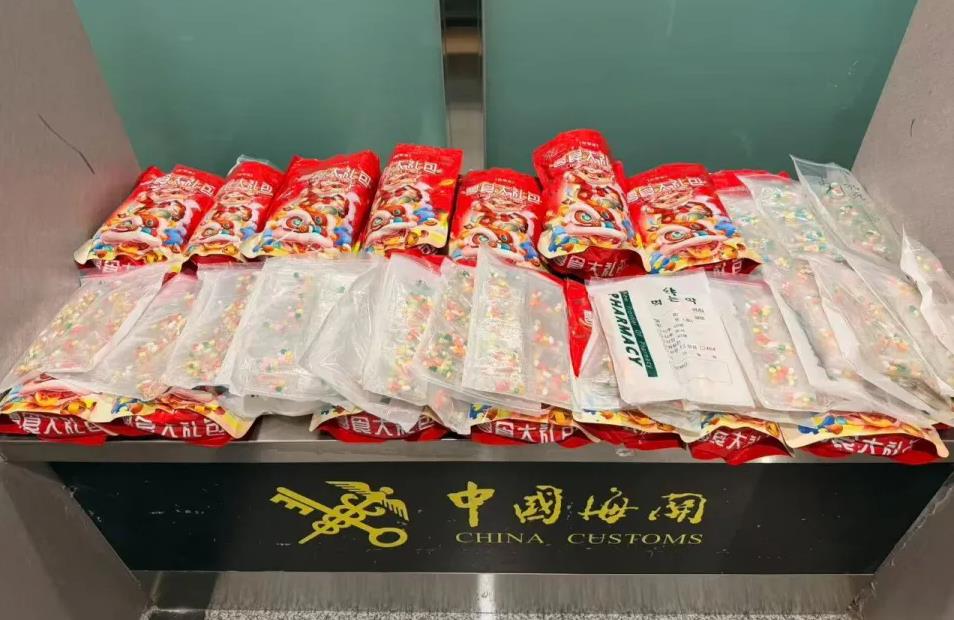 大连周水子机场海关在对一架进境航班进行监管时,发现连续两名旅客的行李物品机检图像存在异常,海关关员在“无申报通道”对两人进行拦截。经开箱查验,两名旅客携带的行李箱中装有大量用零食袋伪装的彩色药片,且该批药片无生产日期、无质量合格证明、无生产厂家,共计4618包、32082粒。经现场快速检测,该批药品呈甲基安非他明阳性。目前,该案件已移交海关缉私部门处理。